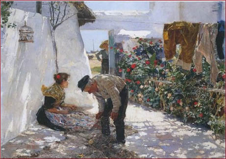 A la sombra reparan las redes. La hija sentada en el suelo apoya su espalda en la pared de una casita humilde, sin duda de pescador; cose las redes, y el padre, mayor, va señalando los puntos que hay que reparar. Al fondo se ven las barcas y el mar de Valencia. Lo demás es luz, blanca en los muros, aún en sombra, y en el pasillo del jardín; y azules en el cielo y en el mar.